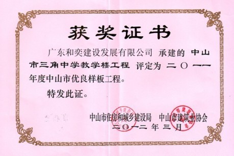 《中山市三角中學(xué)教學(xué)樓工程》優(yōu)良樣板工程榮譽證書