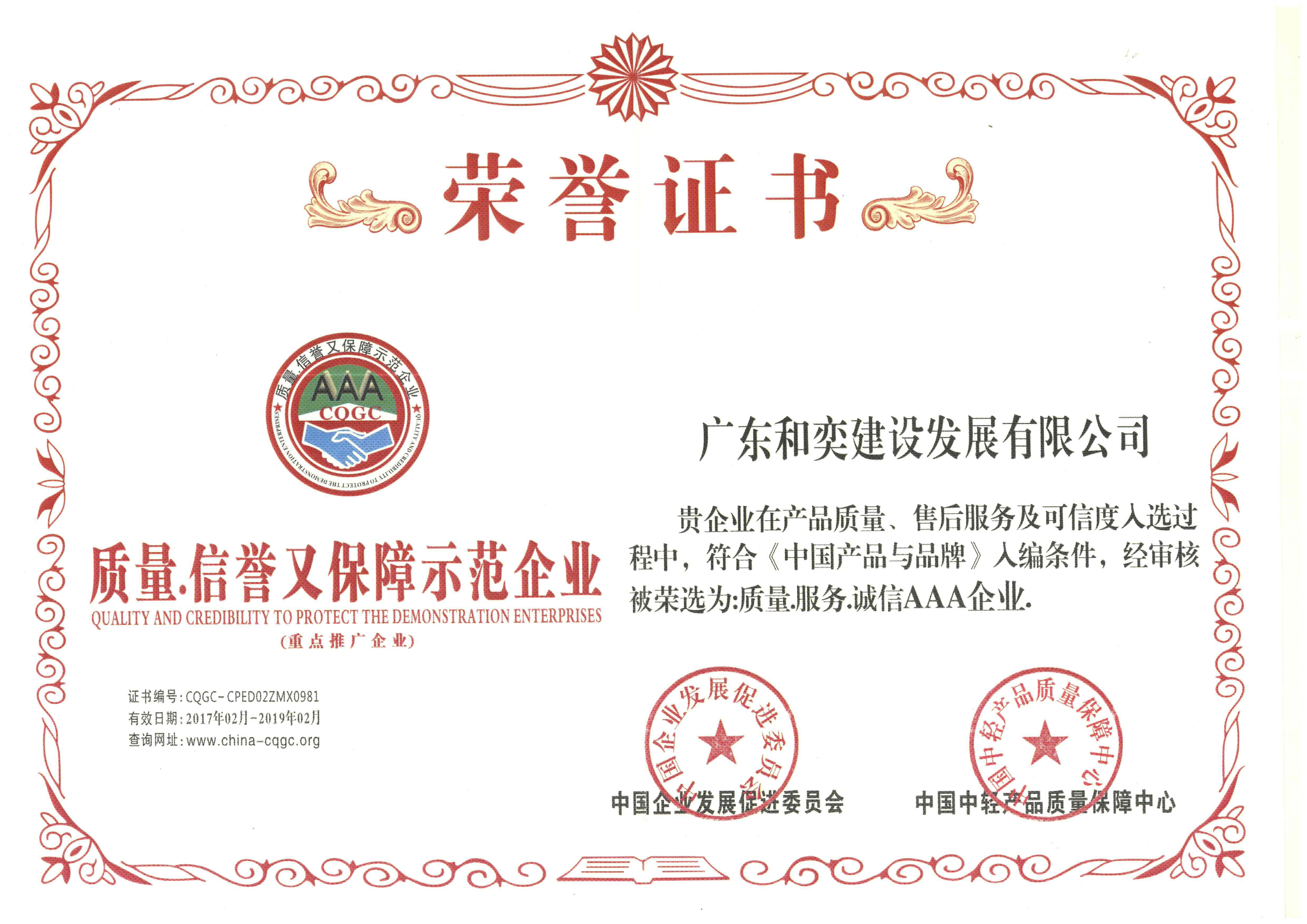 “廣東和奕建設發(fā)展有限”榮獲《質量、信譽保障示范企業(yè)》榮譽證書