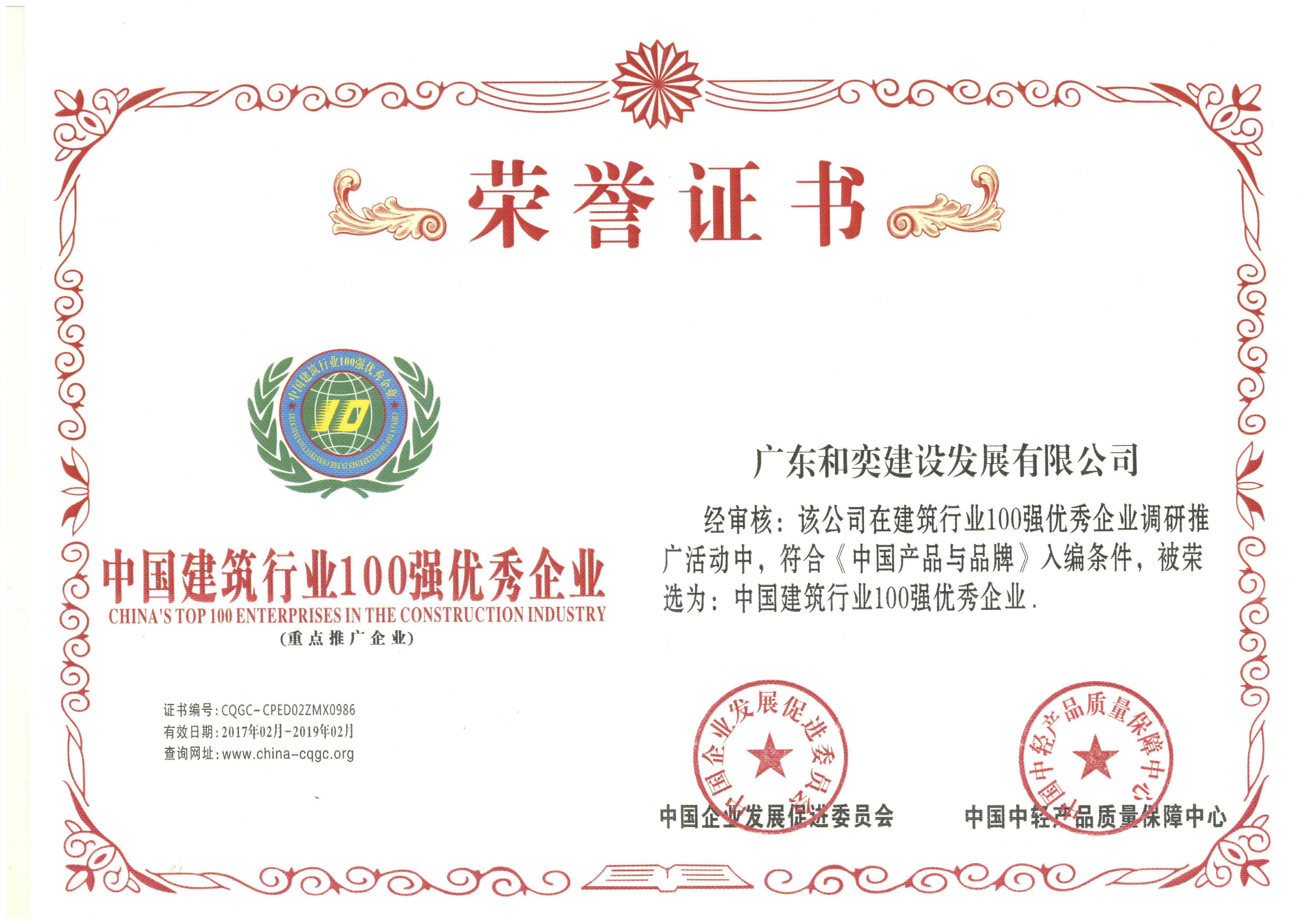 “廣東和奕建設發(fā)展有限公司”榮獲《中國建筑行業(yè)100強優(yōu)秀企業(yè)》榮譽證書!